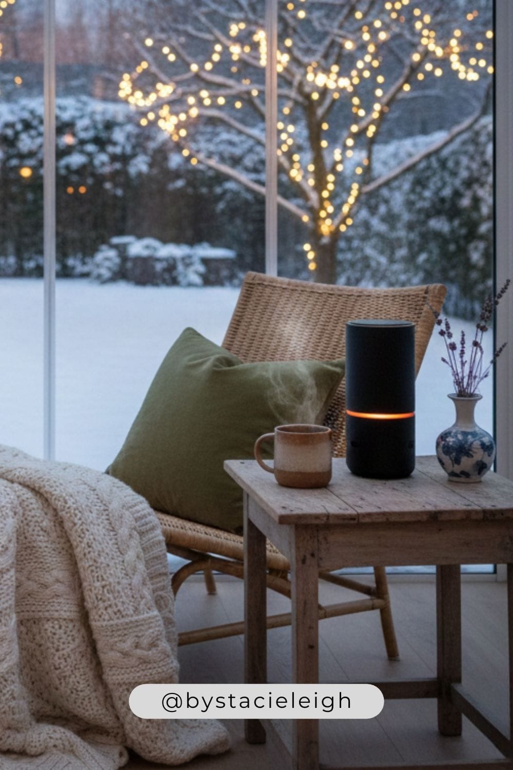 - Layering Winter Frequencies: In winter, natural sounds are quiet. You must “fill” the silence. Use your speaker system to play “Snowfall Ambience” or “Crackling Hearth” layered with soft acoustic music. This prevents the room from feeling “hollow.”
